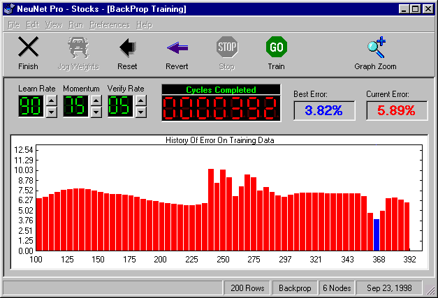 - After repeating several training cycles, a "verify" cycle is run and the screen is updated to show the current prediction error.
